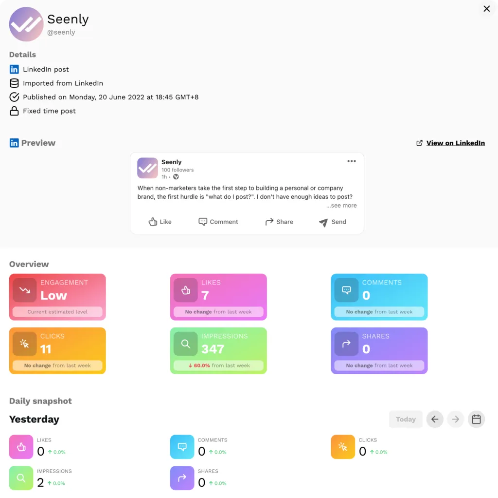 Seenly combines analytics with smart scheduling, content recommendations, and post-interaction automation, making it a comprehensive solution for marketers. - How can Seenly improve my LinkedIn performance?